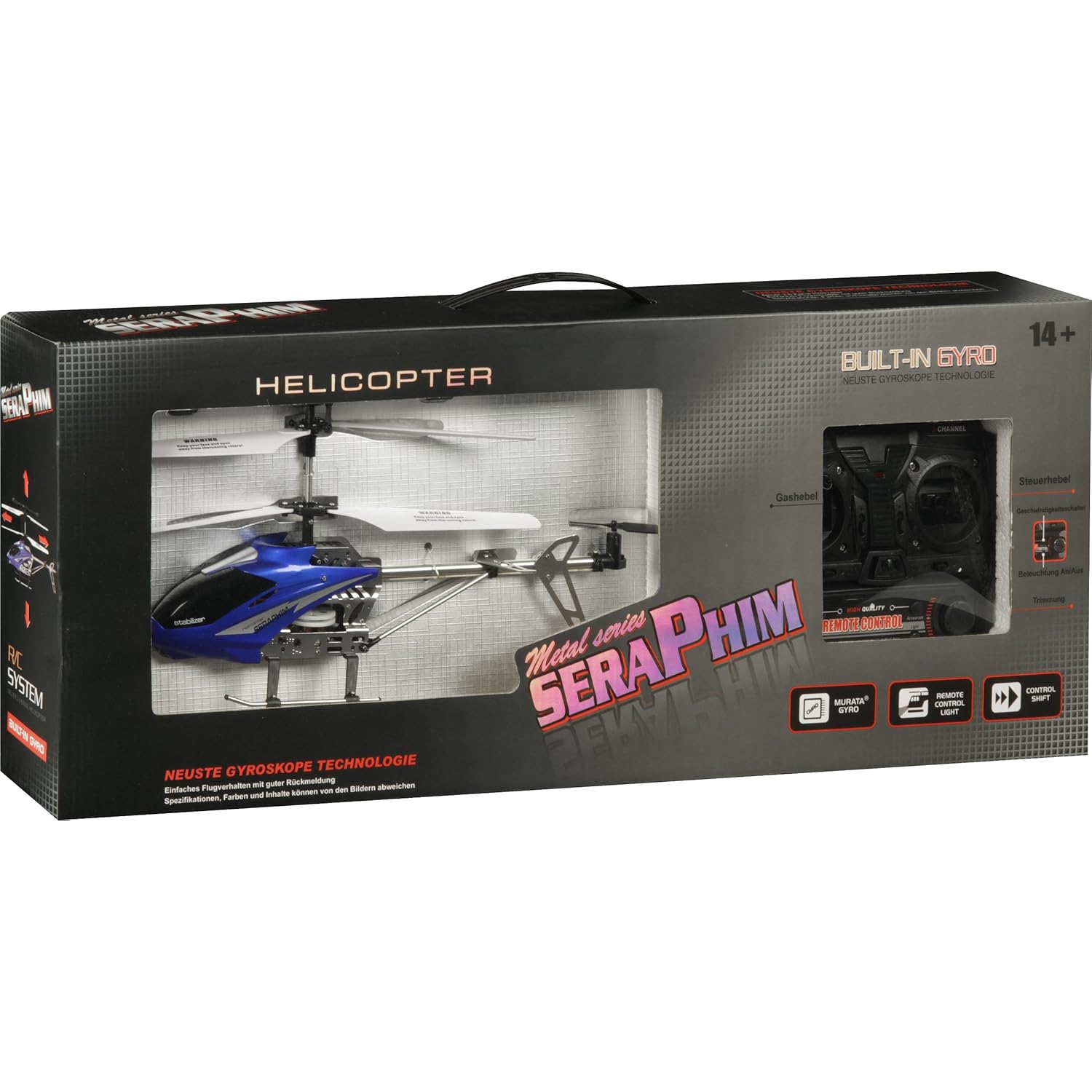 Eigenschaften ausziehbare und abschraubbare Antenne, exakte 360°-Steuerung, Ein-/Aus-Schalter, rote Power-LED, Lichtschalter, Drehregler, ein 2-Richtungen-Joystick, ein 4-Richtungen-Joystick, Batteriefach