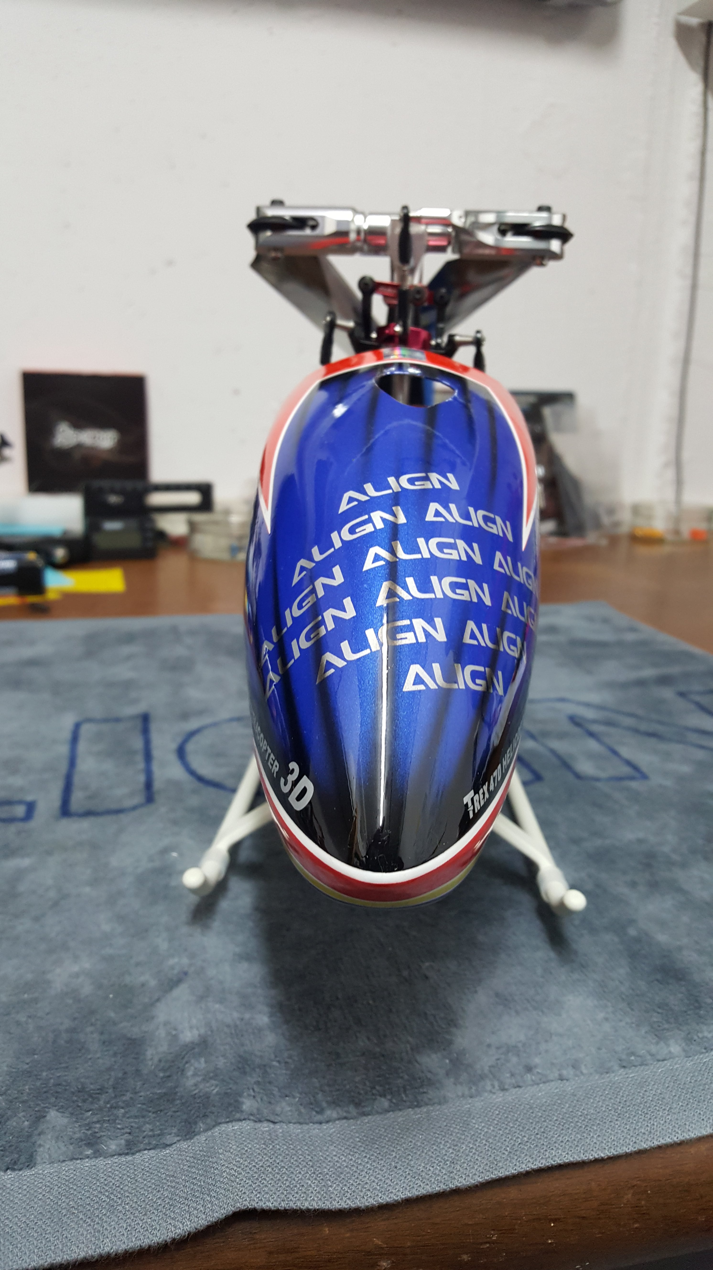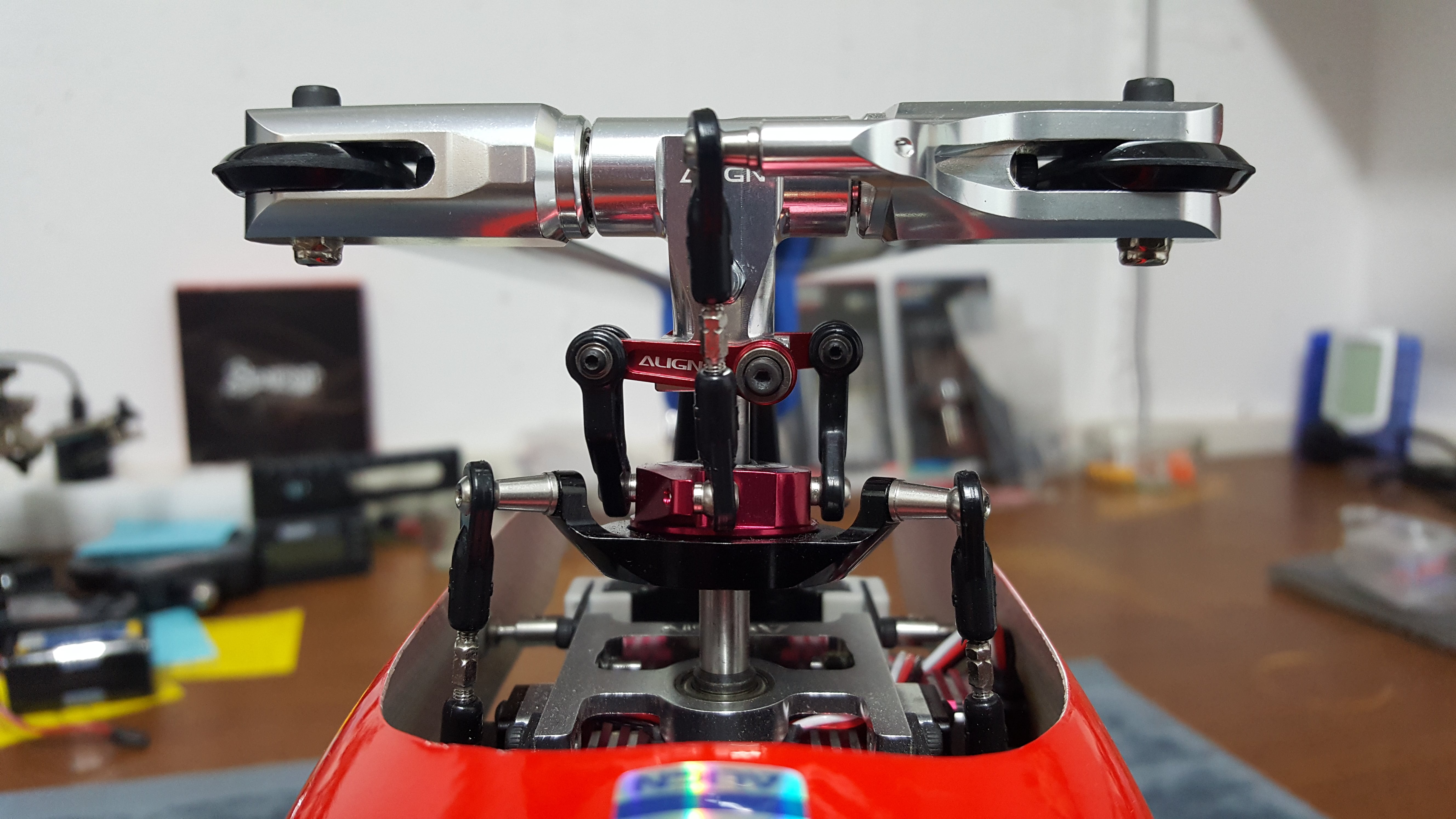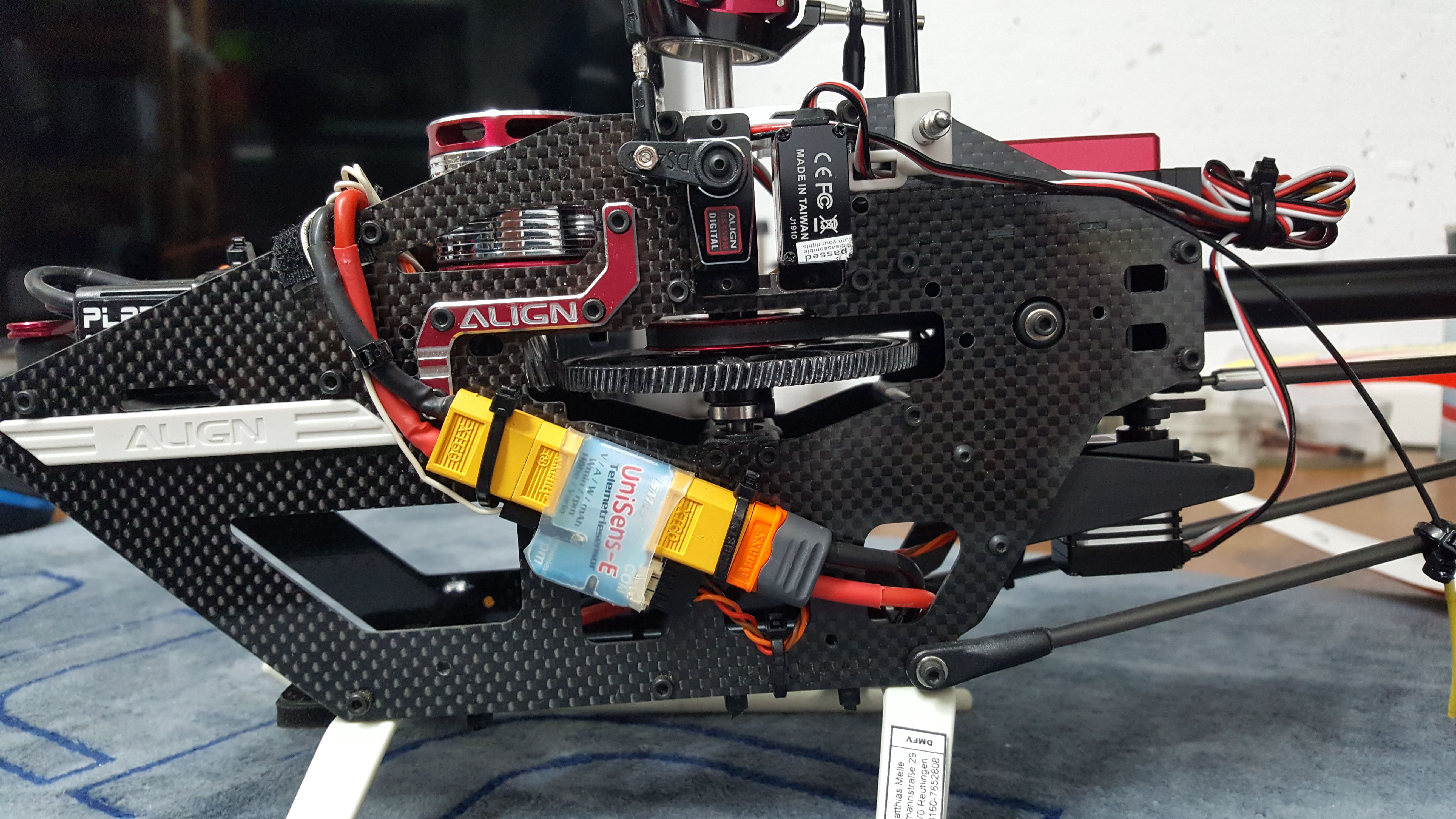 Wie auf den Bildern zu sehen, wurde die Haube beidseitig im Bereich des HZR sauber ausgeschnitten, da die ALIGN Hauben sehr eng sitzen. Somit kann das HZR nicht an der Haube streifen. (Wen das stört, die Originale kann man für 30€ nachkaufen)