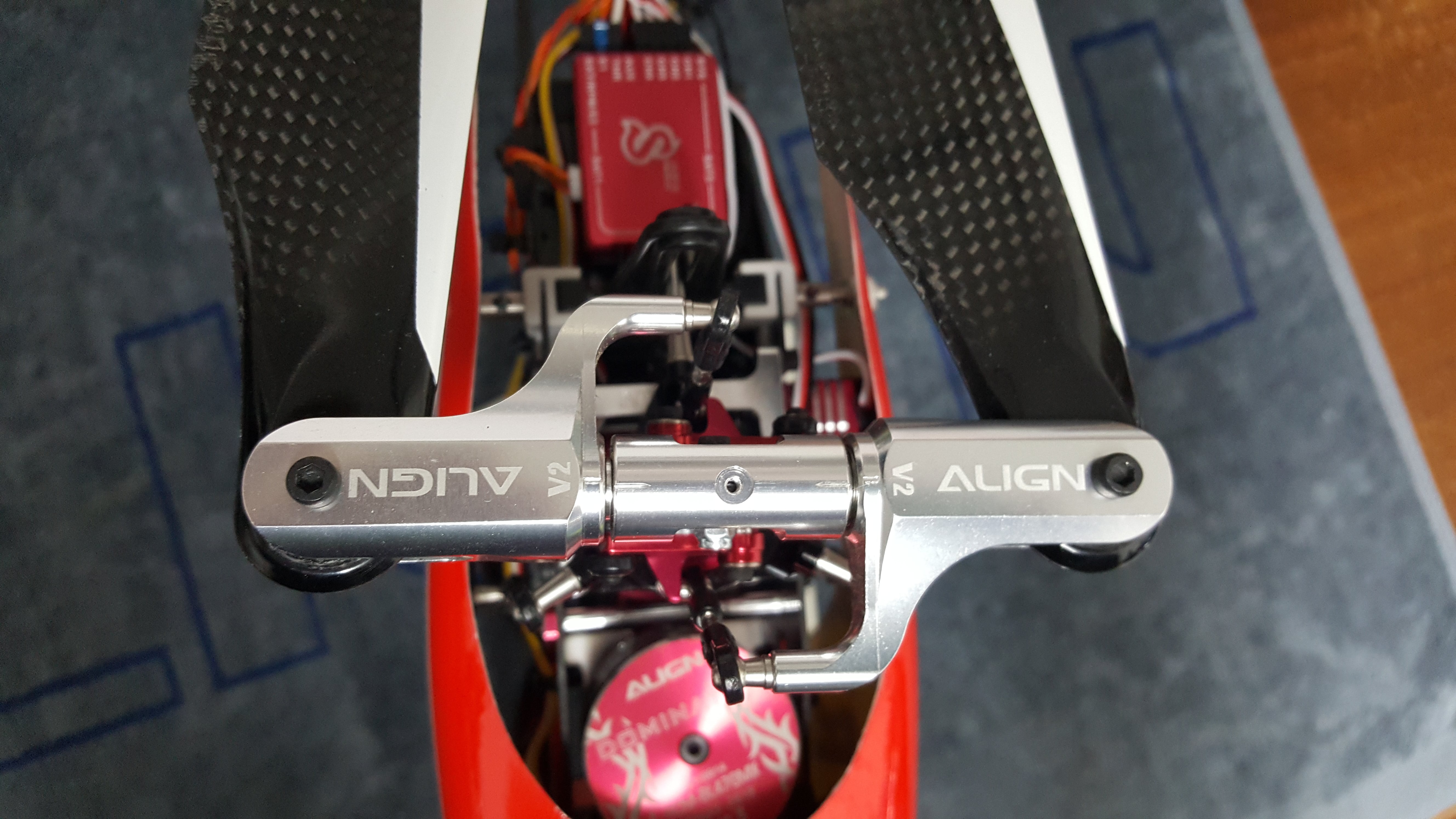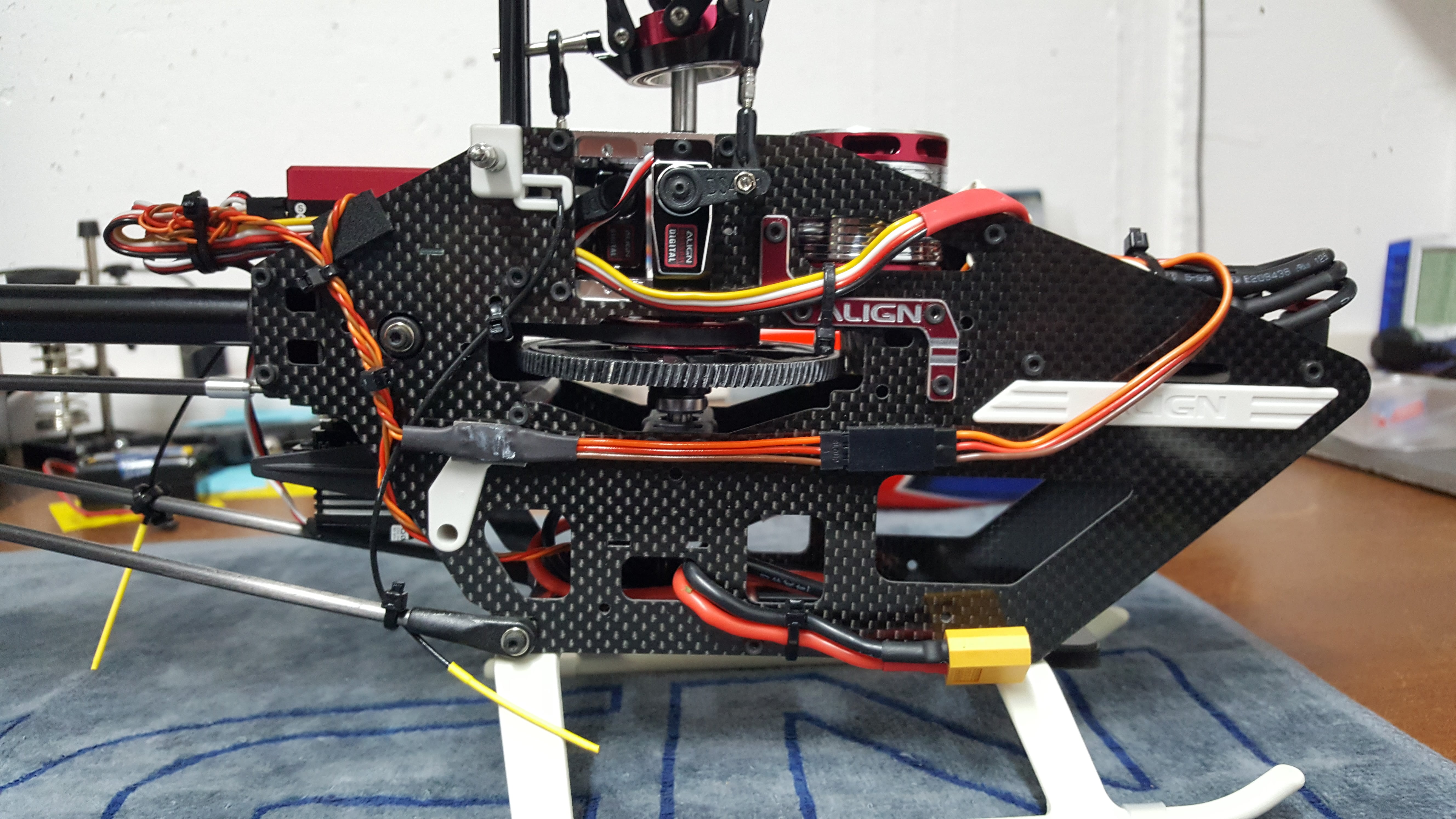 Wie auf den Bildern zu sehen, wurde die Haube beidseitig im Bereich des HZR sauber ausgeschnitten, da die ALIGN Hauben sehr eng sitzen. Somit kann das HZR nicht an der Haube streifen. (Wen das stört, die Originale kann man für 30€ nachkaufen)